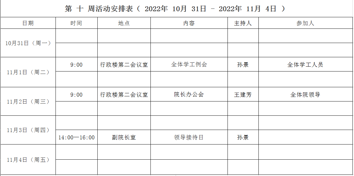第 十 周活动安排表( 2022年 10月 31日 - 2022年 11月 4日 )