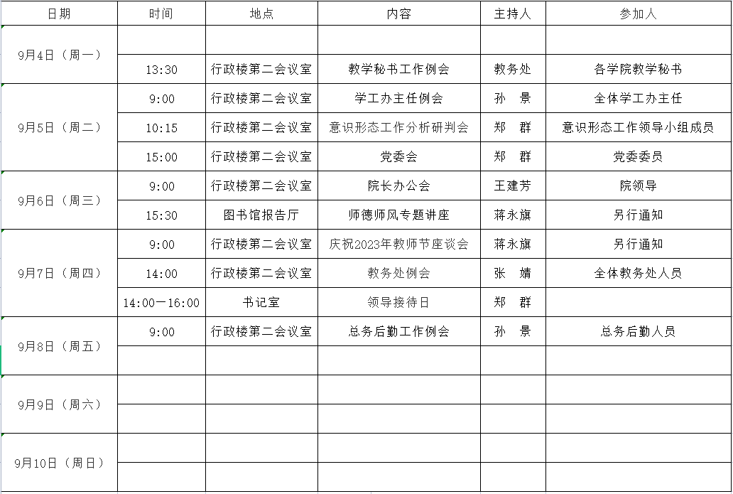 第 二 周活动安排表( 2023年 9月 4日 - 2023年 9月 10日 )