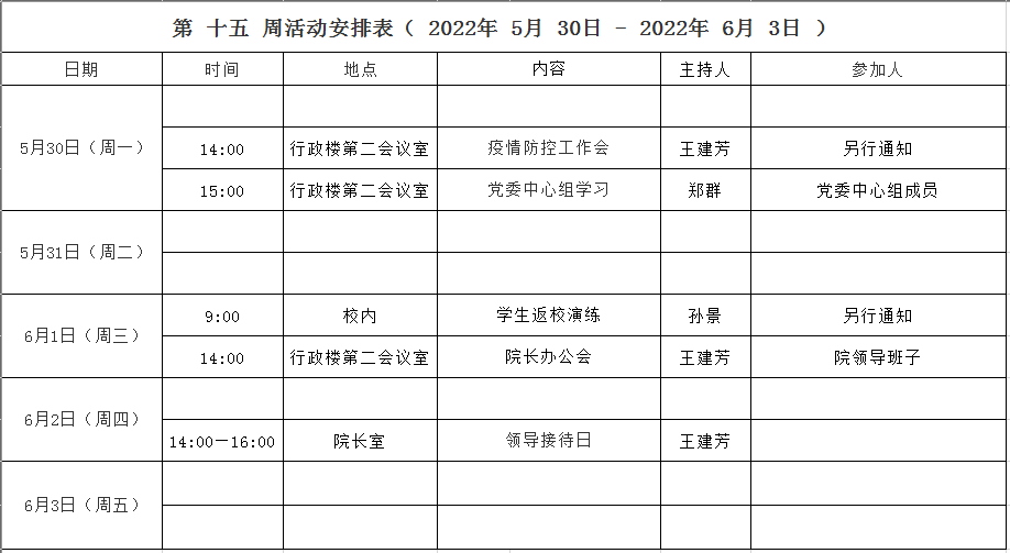 第 十五 周活动安排表( 2022年 5月 30日 - 2022年 6月 3日 )