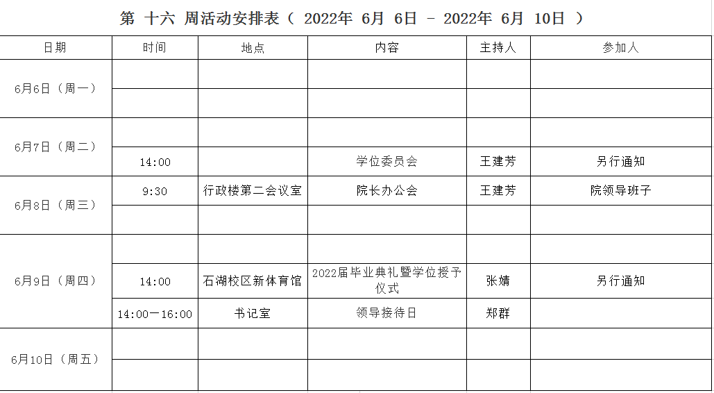 第 十六 周活动安排表( 2022年 6月 6日 - 2022年 6月 10日 )