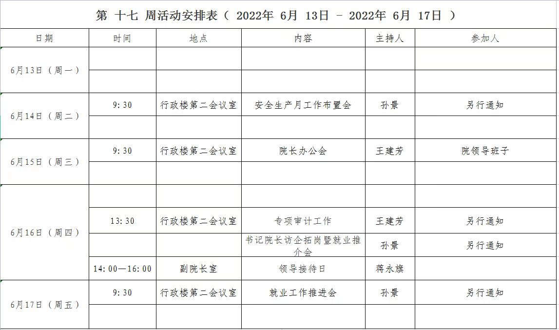 第 十七 周活动安排表( 2022年 6月 13日 - 2022年 6月 17日 )