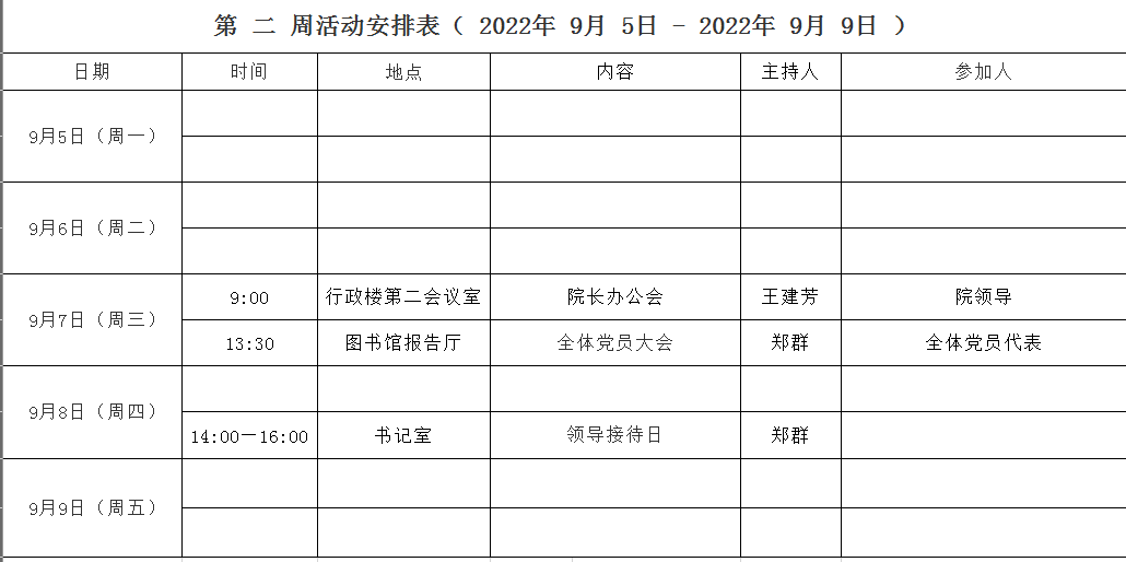 第 二 周活动安排表( 2022年 9月 5日 - 2022年 9月 9日 )