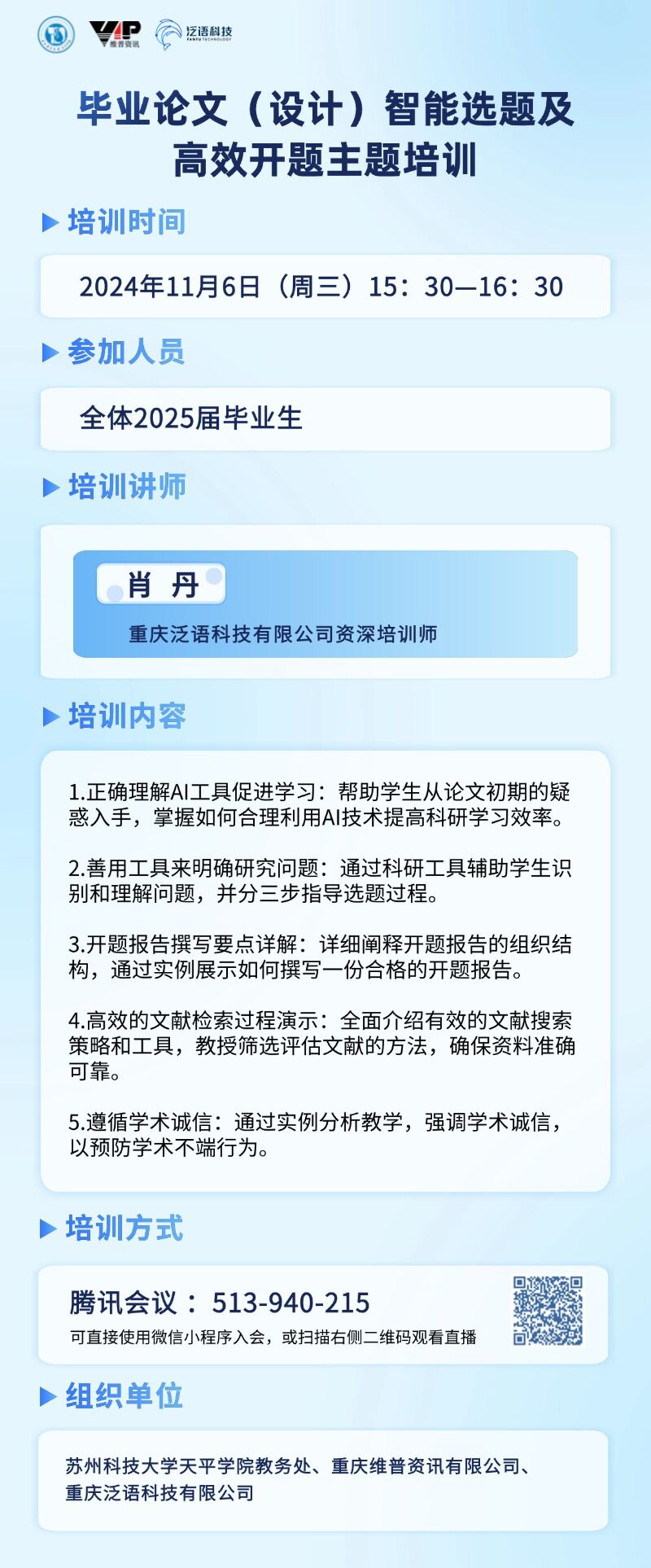 培训形式:腾讯会议直播会议ID:513-940-215(可直接使用微信小程序入会)