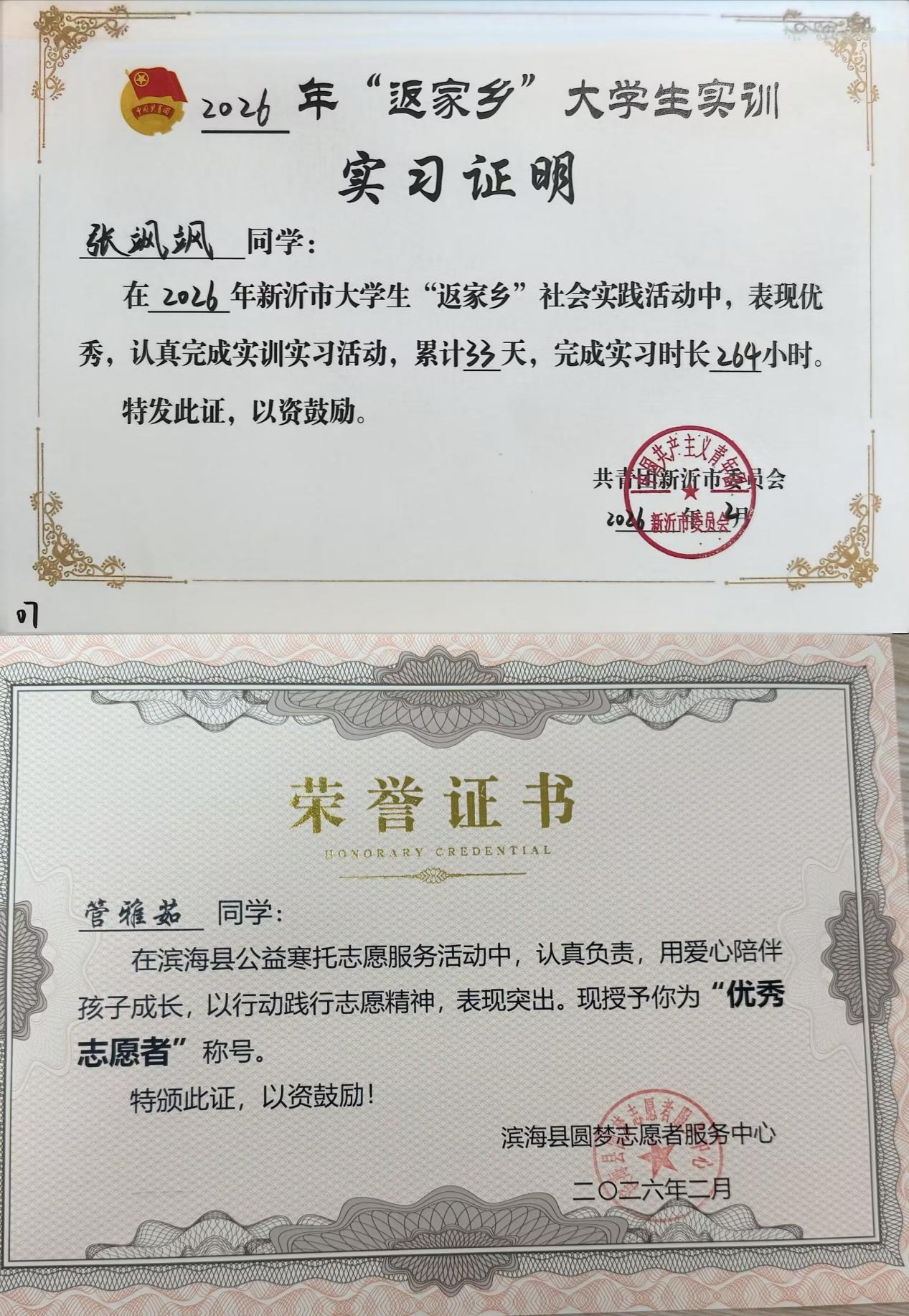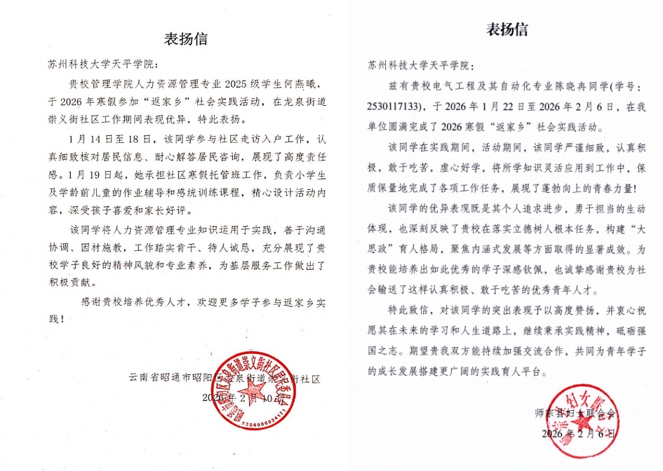 在2026年寒假大学生社会实践活动中,校区学子积极响应号召,围绕“逐梦强国建设,青春挺膺担当”等主题,深入家乡基层,投身志愿服务、文化传承等各式各样、内容丰富的实践活动。期间,多名同学因其突出表现,收到了来自家乡相关部门的表彰,为校区赢得了良好的社会声誉。
