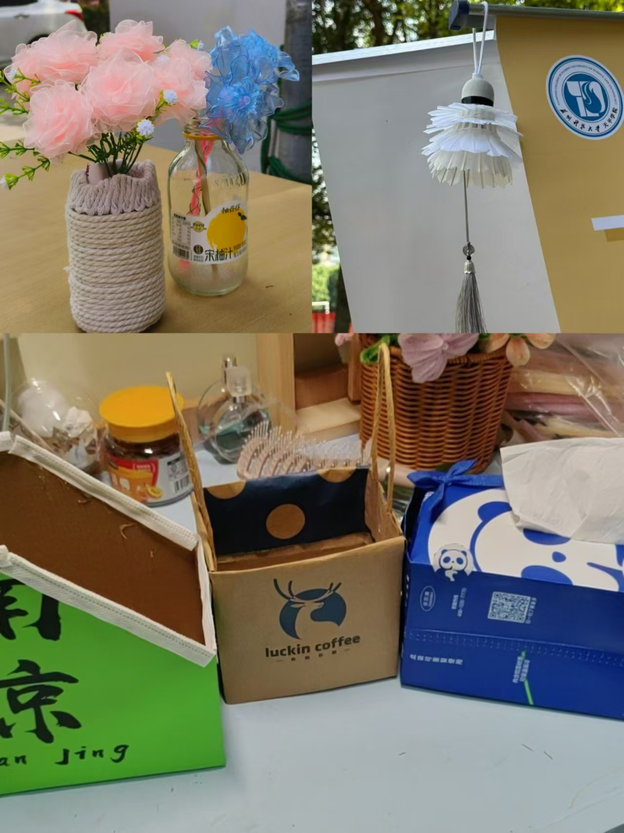 活动现场,来自院青协志愿者们纷纷亮出自己的“变废为宝”作品。这些作品不仅造型独特、创意十足,而且实用性强,让人眼前一亮。有的同学用废弃的纸张制作成了漂亮的纸质花盆,不仅美化了环境,还充分利用了废弃资源;还有的同学用奶茶包装袋制作抽纸盒,既环保又有创意。