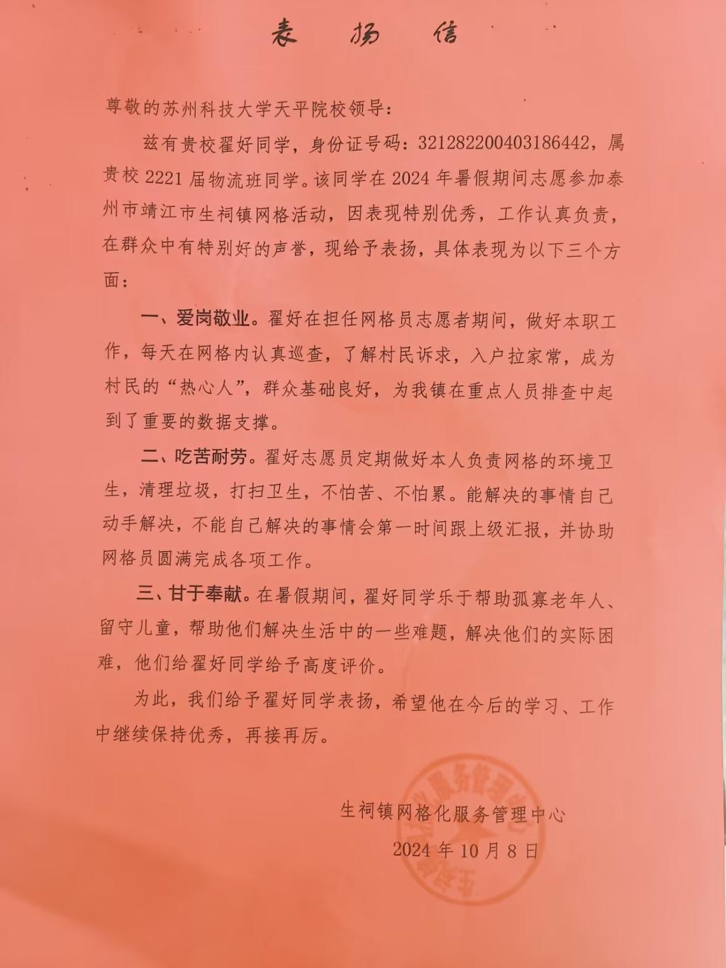 近日,管理学院收到了一封来自泰州市靖江市生祠镇网格化服务管理中心的表扬信,信中高度赞扬了bat365官网学生翟好暑假社会实践期间在服务基层、关爱空巢老人方面的杰出表现。这一荣誉不仅是对翟好个人品质的肯定,更是对我们管理学院学子社会责任感和奉献精神的生动诠释。