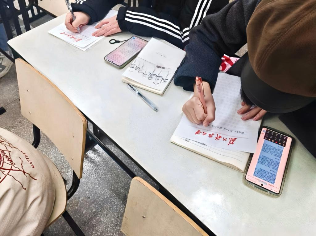 比赛期间,同学们全神贯注,从 10 段富含人生哲理的语句中精心挑选,书写的内容涵盖勤奋、坚持、友谊等诸多主题,随后手持黑色中性笔,落纸如云烟,笔锋游走如龙蛇。字体或苍劲雄浑、力透纸背,或灵动飘逸、婉转流畅,横竖撇捺间,尽显对书法艺术的诚挚热爱以及对文字精髓的深刻领悟。