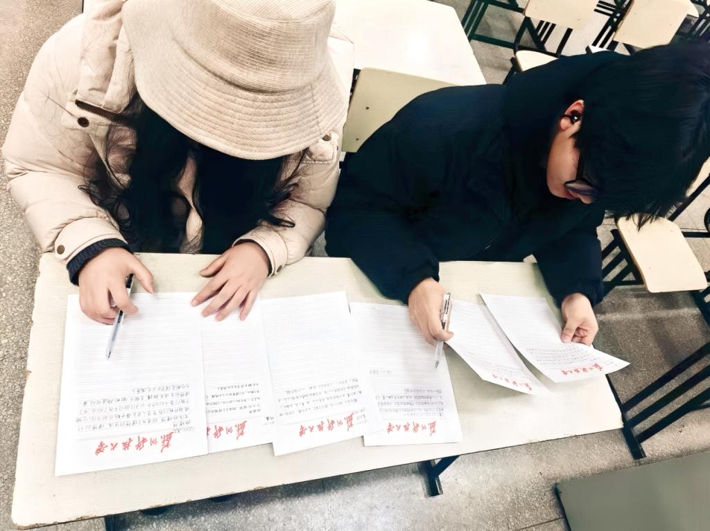 书写环节结束后,首先由现场两位评委进行初步评审。他们目光如炬,从字体的工整规范、笔画的自然流畅、结构的精巧合理以及整体的和谐美观等多个关键角度出发,对每一幅参赛作品进行了细致入微的品鉴。随后,这些作品被呈送至办公室老师处,接受最终评定。老师们秉持严谨、公正、客观的态度,反复推敲、深入研讨,最终评选出一、二、三等奖若干名。