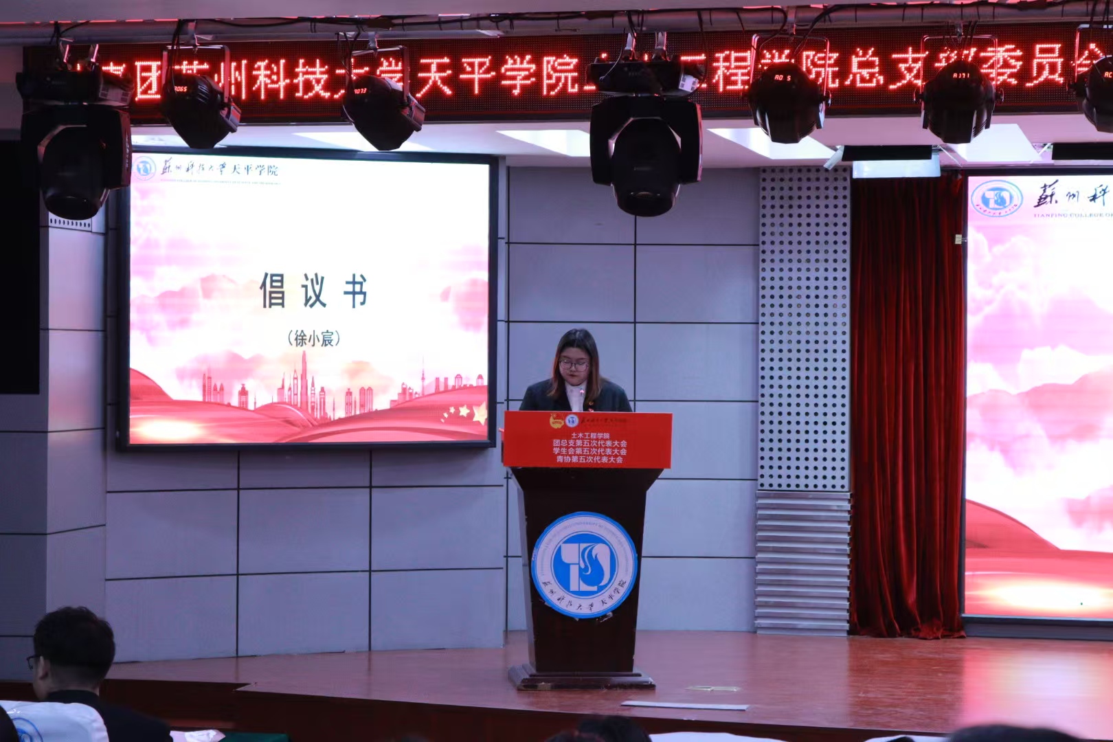 大会第四项议程,由土木工程学院学生分会主席徐小宸同学宣读大会倡议书,倡议我们担当时代责任,勇于砥砺奋斗,树立远大理想,热爱伟大祖国,以青春之姿,书不朽华章。