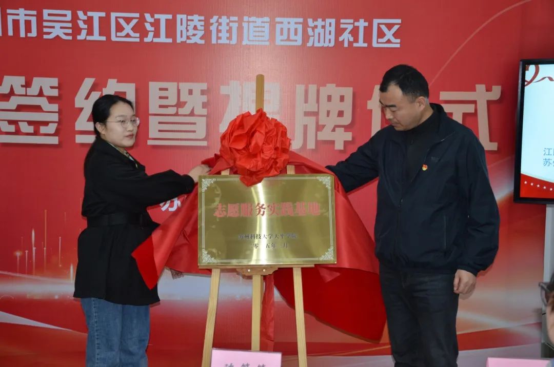 西湖社区党委书记宋玉林与bat365在线中国官网登录入口院团委组织宣传部部长陈箫箫老师共同为“志愿服务实践基地”揭牌,双方合作正式落地,迈向实践深耕阶段。