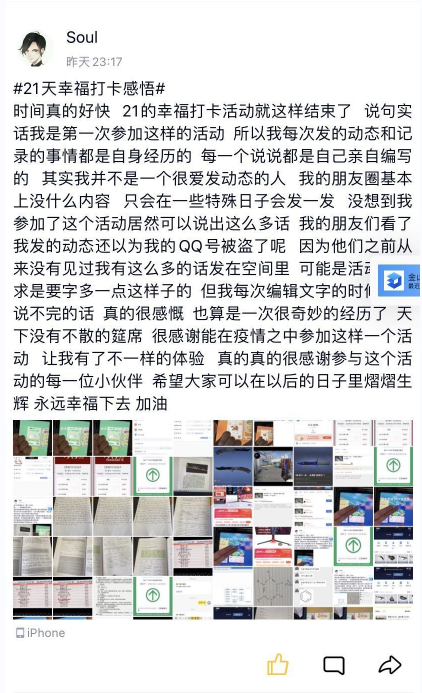 汉语z1923徐欣说:“渐渐不是在为打卡而打卡,开始享受自己完成学习任务时打勾的幸福和快乐。开始发现生活中的小美好,开始关注大自然,有平稳的生活节奏,不会盲目地活着,有着清晰的目标,感谢21天幸福打卡活动,希望自己可以一直幸福下去。”
