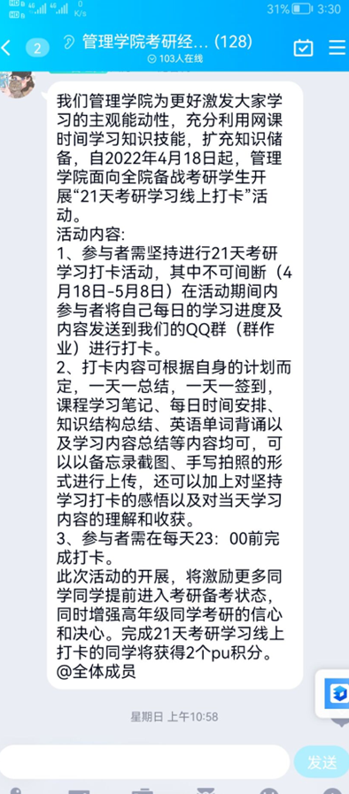 为进一步推进优良学风建设,鼓励同学们保持学习积极性,2022年4月中旬,管理学院面向全体备战考研的学生开展了“21天考研学习线上打卡”活动。