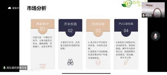 本次答辩组的评委有孙建文、黄文军、武亚荣和吴韦晶四位老师。涉及课题有:后疫情时代下生鲜电商行业的盈利模式及其发展延续性探究 、大学生创新创业教育与就业及创业能力研究与实践和大学生校园服务平台的使用情况分析及优化设计探究。答辩过程中,各组的发言人都详细地阐述了他们的推广策略、市场分析、项目成果等内容。老师们围绕各小组的汇报材料提出了针对性的问题,为项目后续的优化提供了建议。会议最后的自由提问环节,也为参与观看答辩的同学提供了交流学习的机会。