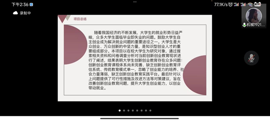 本次线上答辩活动的顺利完成,不仅让参与答辩的同学认识到自己研究上的不足与优化方向,也给观看本次答辩的同学提供了一次很好的学习机会。通过本次活动,bat365官网学子敢于创新、勇于实践的良好精神风貌得以展现,相信管理学院的同学们在这次答辩活动结束后,一定会激发新思路,踊跃加入到大学生创新创业的各项活动中。