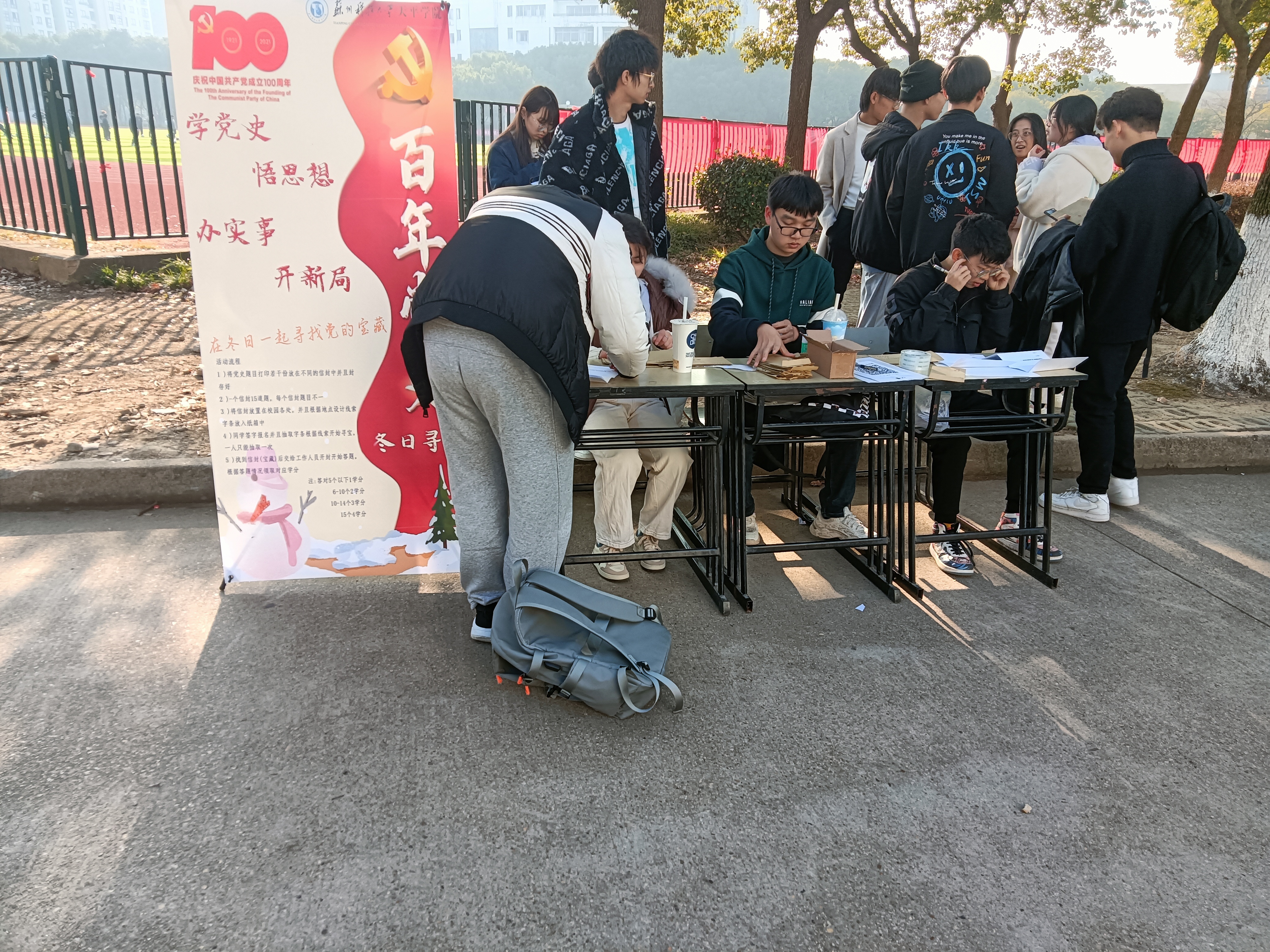 2021年是建党100周年、“十四五”规划的开局之年。土木工程学院以打造“知史、爱党”为目标,开展“学党史、悟思想、办实事、开新局”建党100周年党史学习教育系列活动,进一步构建爱国爱党的良好氛围,在2021年12月14日举办党史冬日寻宝活动。