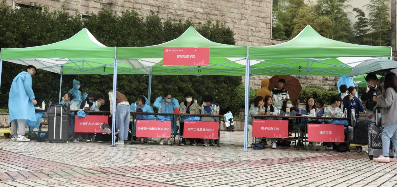 10月16日早上七点智能制造学院团总支、学生会成员及各青年志愿者就已经准备就绪,分布于各个接待点迎接新生。新生陆续来到学校,一对一的志愿者接到新生后带领新生进行入学相关流程:检查行程码、健康码、核酸检测报告,到图书馆门口签到后进入图书馆领取一卡通及住宿单,最后由志愿者带领回到各自宿舍放置行李等物品。在所有志愿者的积极配合下,志愿服务工作有条不紊地进行。尽管风雨交接,志愿者们也没有打乱自己的节奏,反而报以更大的热情。