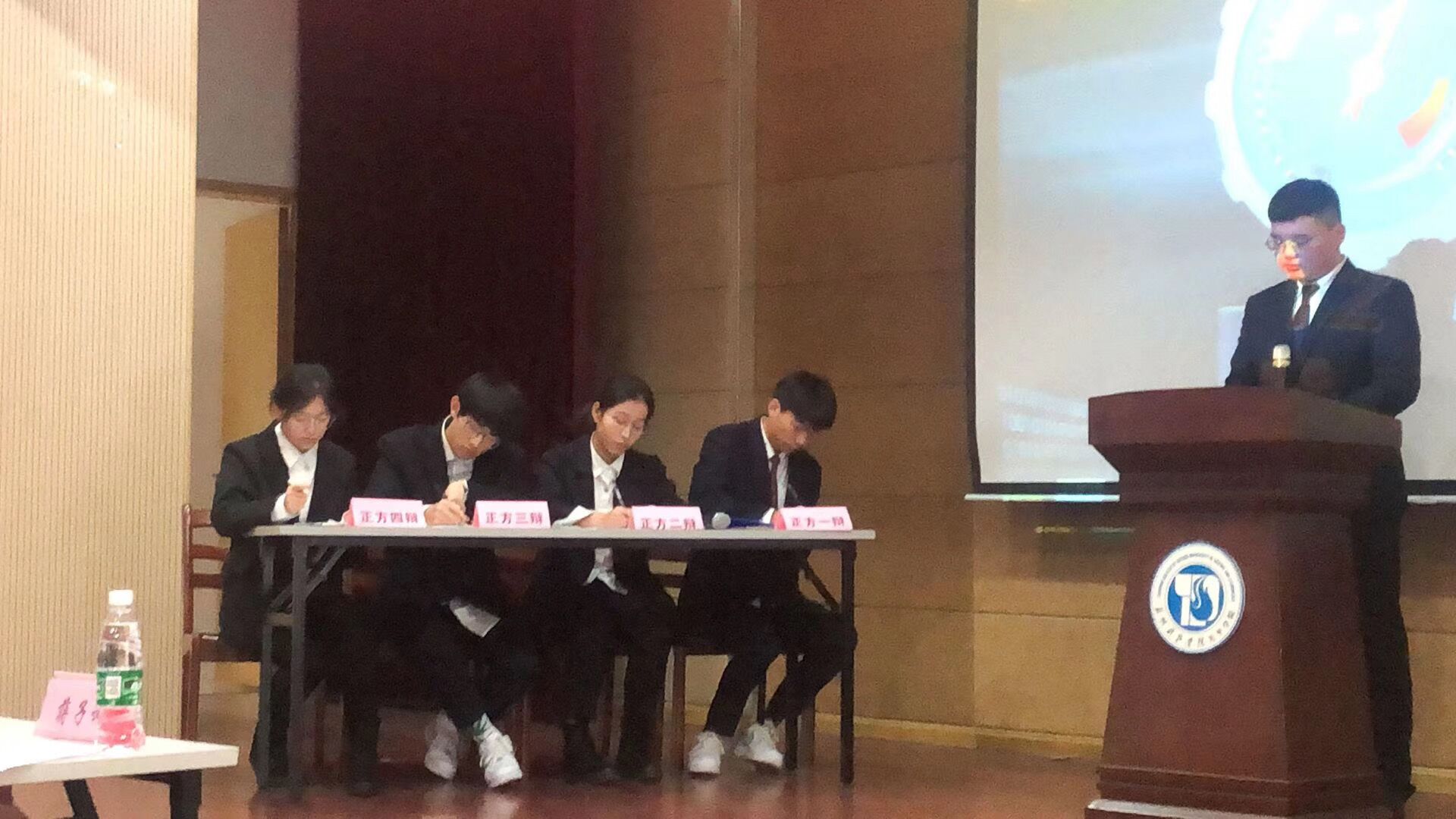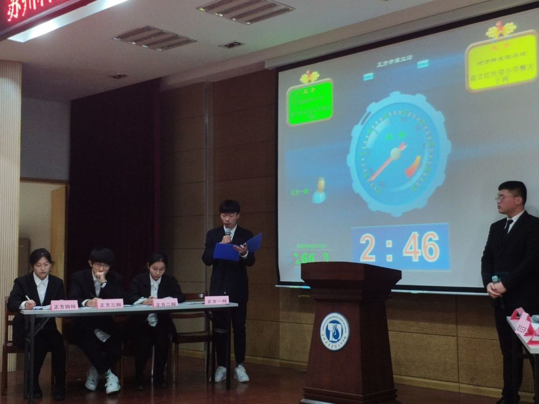 辩论赛在本周下午于学校报告厅举办,分为正反两方,他们神情严肃,各队伍认真备赛,仔细查找与辩题相关的资料,精心设计辩论技巧,奋力赛出风采,时刻准备着。比赛共分为四轮,双方攻守兼备、借古喻今,辩论现场,各参赛选手围绕辩题旁征博引,充分运用多种论辩手段,从不同角度切入,据理力争,各不相让,精彩不断,尤其是在最精彩的自由辩论环节,现场气氛迅速升温,精彩不停掌声不断。最后评委的现场点评亦是让在座同学尤其是辩手们获益匪浅,特别是让同学们了解到真正赢的一方不是谁的辩言无懈可击,而是谁更能说服对方。展现了新时代大学生的思辨精神和青春风采,给现场的百余名师生带来了精彩的思辨盛宴。经过一番唇枪舌战,最终正方取得最后的胜利。