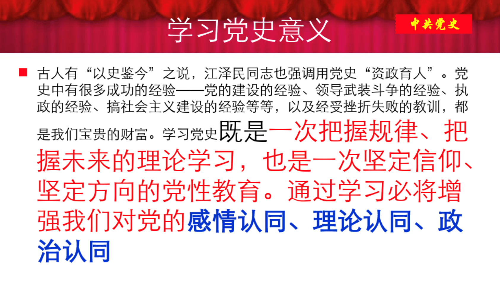 通过学习党的历史,我们深刻理解党的领导是历史的选择、人民的选择,深刻理解“中国共产党为什么能、马克思主义为什么行、中国特色社会主义为什么好”,不断增强中心党员干部的党性意识、忧患意识、责任意识和大局意识,和学习贯彻习近平新时代中国特色社会主义思想的自觉性和坚定性,奋发拼搏、开拓进取,以优异成绩迎接建党100周年。