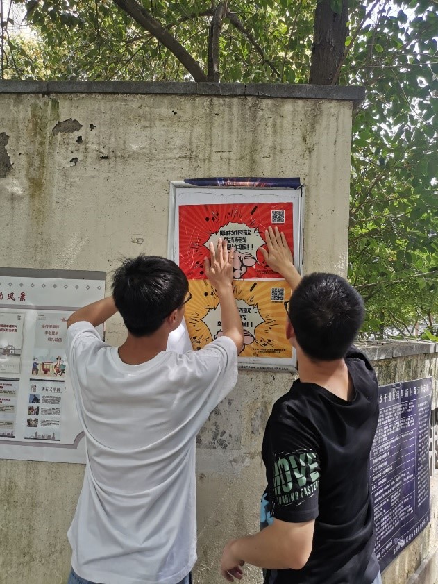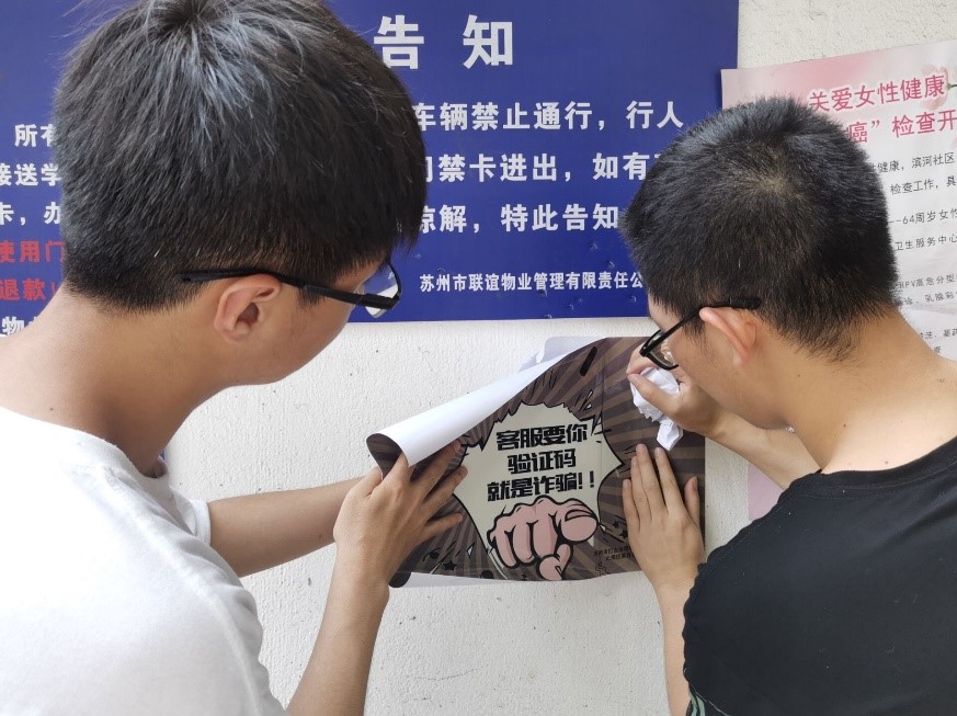 6月9日下午,bat365在线中国官网登录入口土木工程学院青协志愿者,前往江苏省苏州市金阊街道运河社区便民服务中心,协助工作人员在三元三新村进行网络诈骗相关知识宣传以及海报张贴。