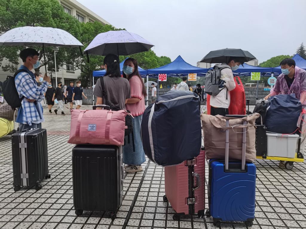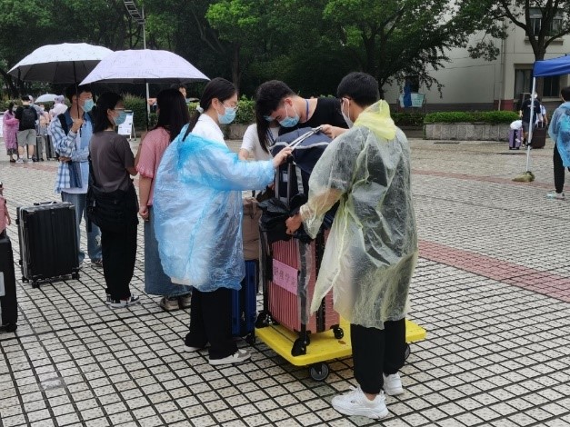 尽管当天天气状况恶劣,但是志愿者们没有任何懈怠,依旧热情地接待每一位新生,帮助他们搬运行李前往宿舍。校园里到处都是他们往返的身影。