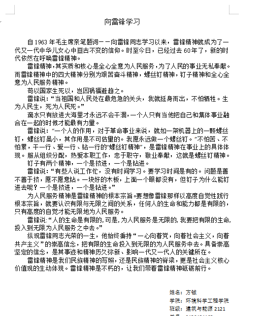 至今,环境科学与工程学院全体师生仍在“学雷锋”,以雷锋为榜样,将雷锋精神落到实处,雷锋精神代代传承,将通过自身的方式传承雷锋精神,在学习生活中继续将其发扬。