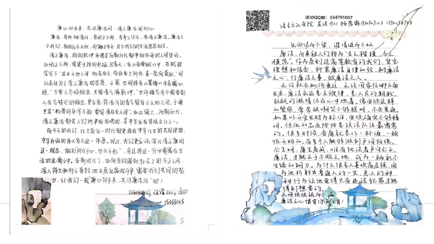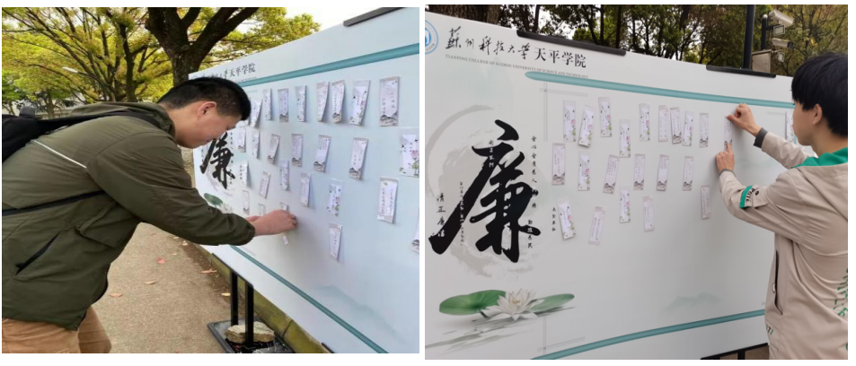 工作人员线下进行摆摊,同学们在相应时间内到达指定地点领取书签并书写有关廉洁主题内容,书写完将书签粘贴在活动立板上。在活动现场,同学们都积极参加,挑选自己喜欢的书签并写上与廉洁有关的宣传语,写完后,同学们将自己写的书签粘在活动立板上。在现场,同学们写的书签展示吸引了更多的同学观赏,进一步宣传了廉洁文化,吸引了更多的同学参与此次活动,活动现场十分热闹。同学们还可以领取到信纸,参与廉洁主题征文活动,展现自己的文采,宣扬廉洁主题文化。
