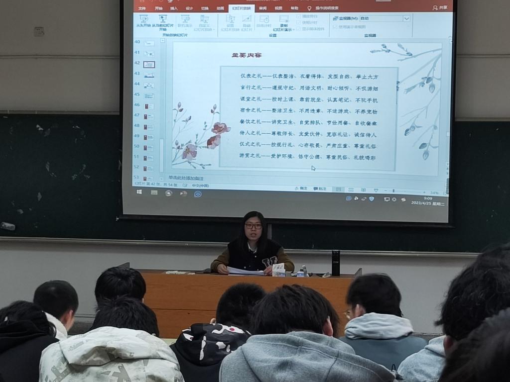 古人云:“不学礼,无以立”,文明礼仪不仅是个人素养的体现,也是个人道德和社会公德的体现,本次活动主要从立德树人根本任务角度出发,引导学生继承中华文明优秀传统文化、注重当代文明礼仪的养成创新和践行。主题班会重点开展了“仪表之礼、言谈之礼、课堂之礼、宿舍之礼、餐饮之礼、待人之礼、仪式之礼、游赏之礼”八大基本礼仪的规范养成教育,结合学生的实际情况,讲述了践行礼仪的重要性。旨在引领学生践行装扮适宜、言谈文明、遵守课堂纪律、保持宿舍安全卫生、珍惜粮食、修行教养、尊重礼俗、知礼重仪的文明行为。