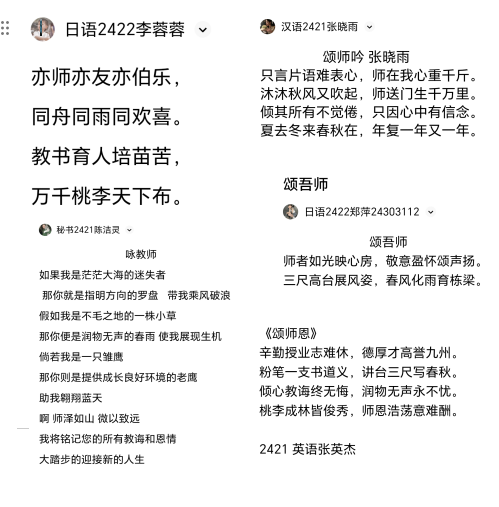 为了庆祝第40个教师节,语言文化学院精心策划并成功举办了一系列精彩纷呈的活动,以独特的方式向辛勤耕耘的园丁们表达最崇高的敬意和最深情的祝福。通过主题征文、诗歌创作等多样化的活动,我们营造了一个尊师重教的温馨氛围,让每一位教师都能感受到节日的温暖。此次庆祝“第四十个教师节”的系列活动不仅加深了师生之间的情感交流,更在学院内外营造出了浓厚的尊师重教氛围,让教育家的精神在每一位师生心中生根发芽。