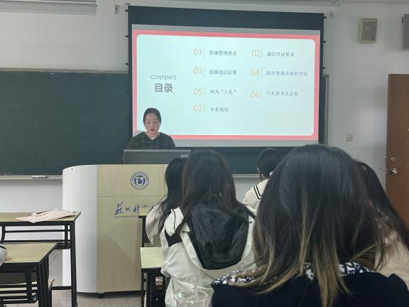为强化学生干部廉洁自律意识,规范日常管理行为,引导班长发挥模范带头作用,2025年11月5日,管理学院学生党支部组织23、24级班长开展廉洁文化专题学习活动。本次学习以“守常规·讲诚信·共成长,学八礼·修其身·赴未来”为主题,系统涵盖常规管理、诚信考试、礼仪修身及未来规划等核心内容。
